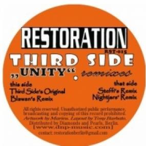 “Unity” is the first single taken from Third Side’s forthcoming album “Unified Fields”, that will be released on Restoration Records in September 2012. TIP!Third Side is the project of The Analogue Cops and Panorama Bar resident Steffi; their collaborations, which have been released exclusively on Restoration, have been of the most interesting jams of the last years. The original “Unity”, a fat overshadowing deep techno track, written and produced only with machines and recorded on tape, comes with 3 massive analogue remixes. The rework made by Blawan (SheWorks/Hessle Audio) smashes the parts of the composition with overbearing oldschool British manners and the result is a broken shuffled industrial hammering. On side B, Steffi’s remix is relentless, rushing and carefully build: her attention for the processing of every detail transforms the original tune into an hypnotic breathtaking excursion. The last treatment is performed by the Nightjars, an unidentified project that has brought down a particular attention for its debut EP on Vae Victis Records. With a bossy employ of the most advanced analogue equipment, the Nightjars slash an incendiary attack of warehouse garage.
